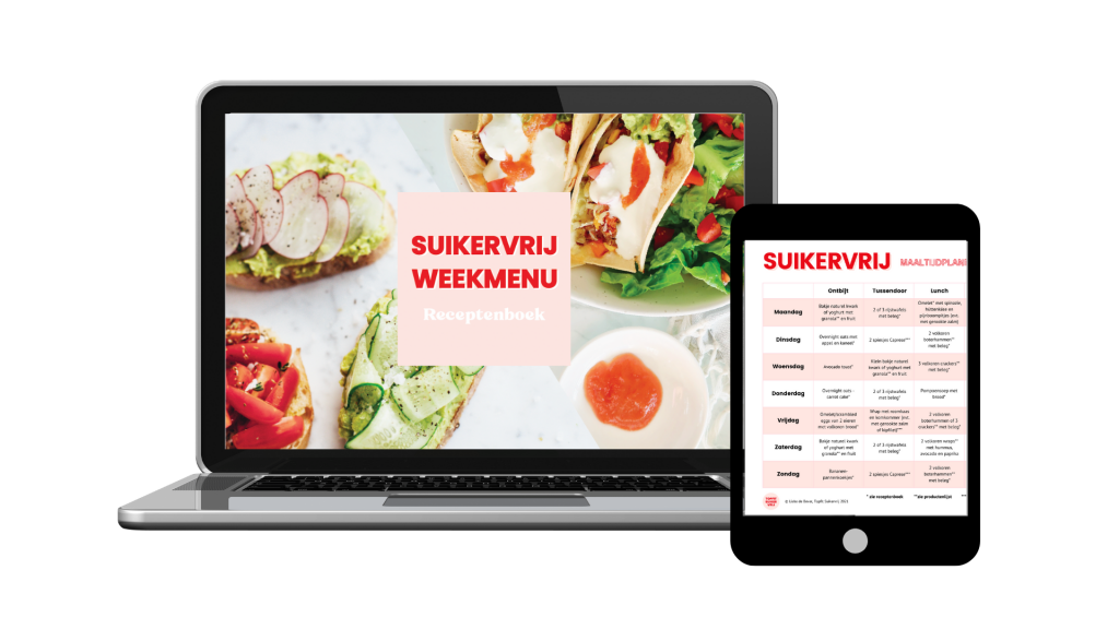 Daarom heb ik iets voor je waarmee het zetten van die eerste stap een stuk gemakkelijker wordt. Ik heb een volledig weekmenu met suikervrije maaltijden, inclusief receptenboek, voor je opgesteld waardoor je niet meer na hoeft te denken wat je dan kunt eten.